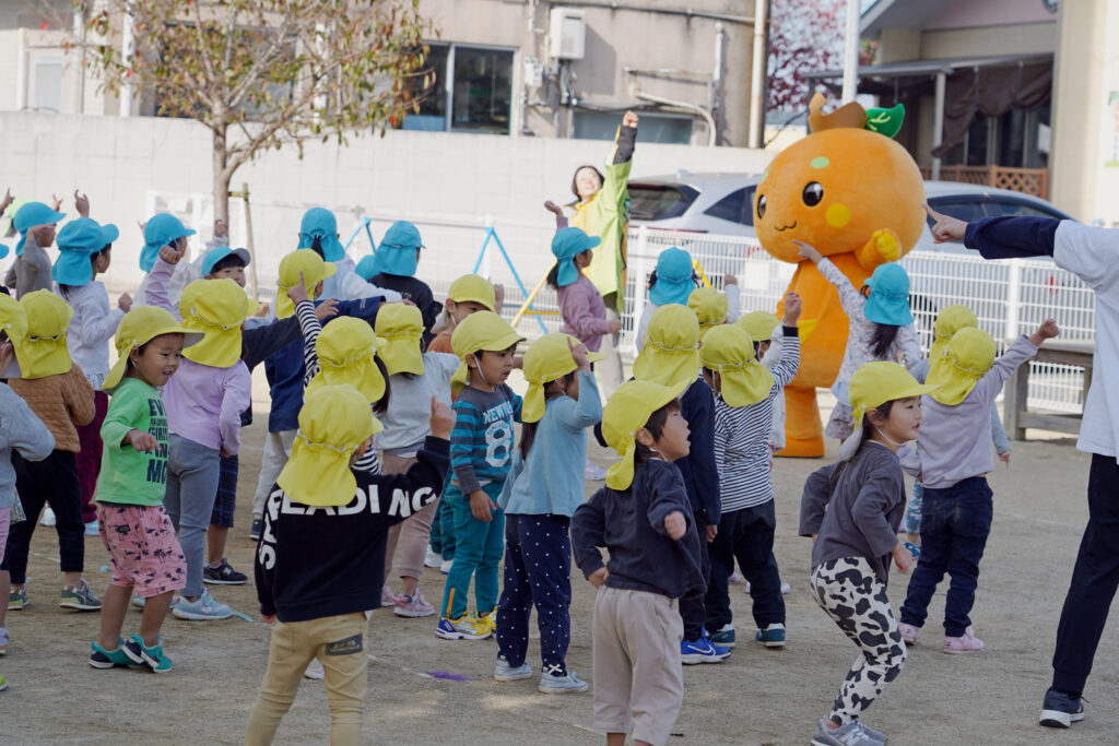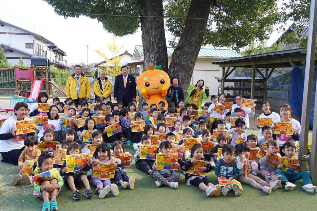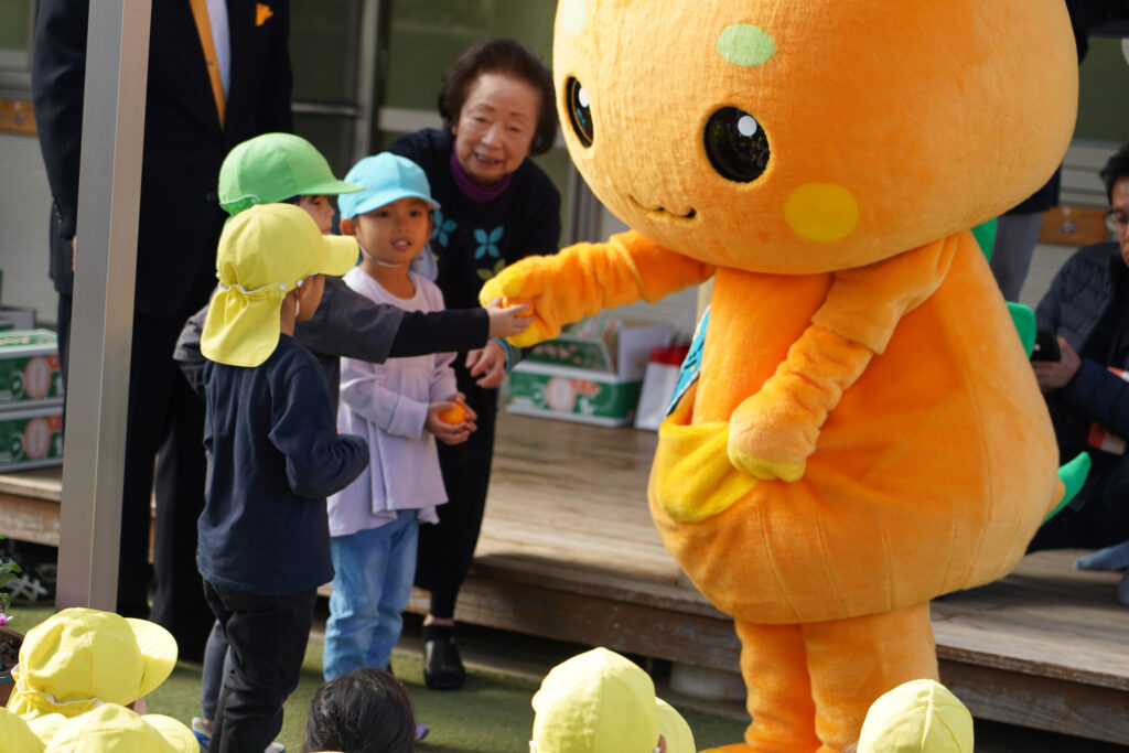 2025.11.20 お知らせ特集 食農教育活動30万人超え ジューシーくんが保育園を訪問♪ JA熊本果実連では、熊本県産果物の消費拡大と果物の魅力を伝えることを目的に平成22年から熊本県と連携して県内の幼稚園・保育園にミカンを贈る「食農教育活動」を行っています。これまでの提供人数は30万人を超えました。 11月19日(水)、JA熊本果実連とジューシーくんが玉名市の玉名くすのき保育園を訪れ、県産ミカンを贈りました。 ジューシーくんからミカンをプレゼント! ジューシーくんダンスを一緒に踊りました 最後はみんなで記念撮影!